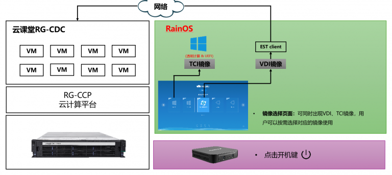 在虚拟化层,是指在智能云终端上运行虚拟化平台,通过虚拟化平台为智能云终端提供云桌面服务,并将云终端的硬件底层充分调用,将底层硬件资源直接透传到虚拟机当中,让虚拟机拥有与真机一样的性能。智能云终端搭载的虚拟化层可以独立运行虚拟机,不依赖云主机性能。另外在虚拟化层提供关机即还原的机制,让机房可以快速回复新的环境,让管理更容易,问题出现几率也大大降低。