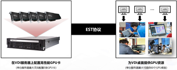 云桌面系统架构图参考如上图所示,单台服务器最大可插5张标准版显卡或3张专业版显卡,单台服务器最大可提供60个带有GPU的VDI桌面(5*12),每个桌面都拥有GPU资源,桌面性能更高。具体包括以下三个特点: