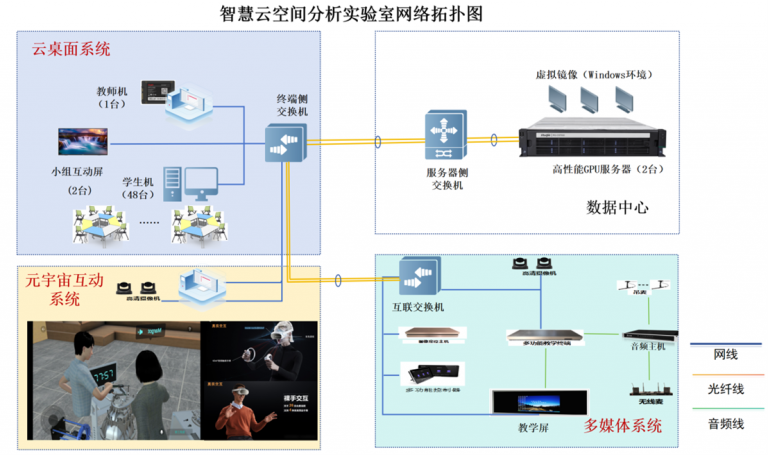 本项目涉及3个方面的建设,分别为元宇宙、云桌面以及多媒体教室,各系统间采用两台千兆交换机进行内部终端和设备的互联,分别连接云桌面系统、虚拟仿真系统和多媒体系统,两台交换机之间使用千兆光纤双链路互联,同时采用两条万兆光纤直连数据中心服务器万兆交换机接入校园网,确保本局域网数据传输的高可靠。总体网络架构如下: